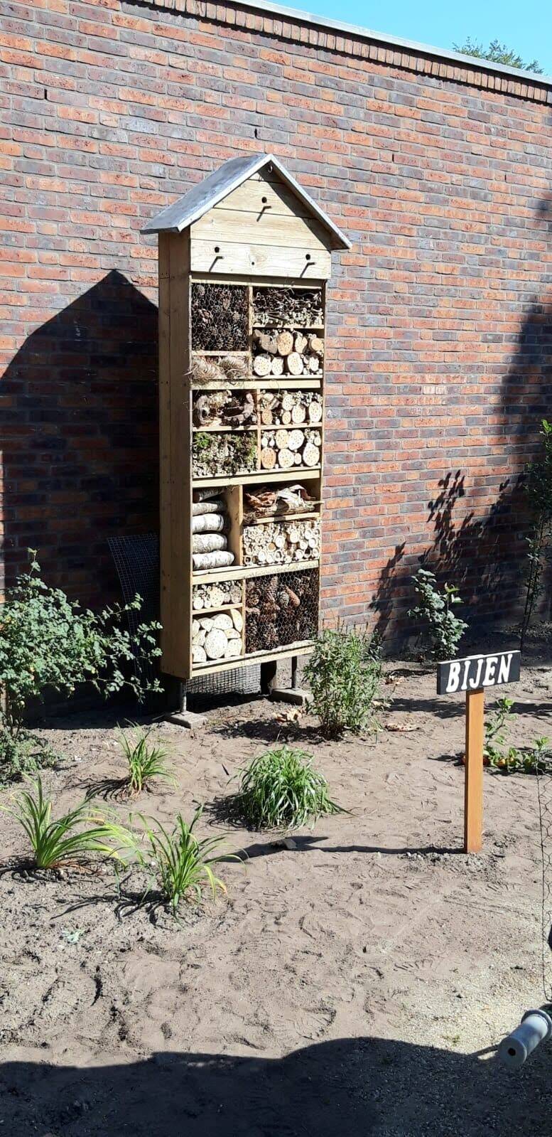 In onze beleeftuin is er, meteen bij de nieuwe inrichting ervan, al een plaatsje gereserveerd voor een onderkomen voor hommels, bijen, vlinders, mieren en andere insecten. Dit zogenaamde insectenhotel is nu door enkele kinderen, onder het toeziend oog van enkele vrijwillgers, ingericht en officieel geopend. En nu maar hopen dat er binnenkort uitgebreid gebruik van wordt gemaakt!
