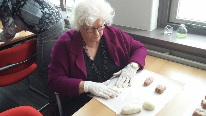 Henk begon uit te leggen hoe we moesten beginnen. Hij had al netjes de bolletjes deeg en het gehakt voor iedereen in porties verdeeld. Dus iedereen kon beginnen om worstjes te draaien en dit in het deeg te verwerken. Henk deed het netjes voor en het zag er heel simpel uit. Nu zelf aan de slag. Dat viel niet zo mee maar het was ontzettend leuk om te doen. Iedereen deed zijn uiterste best om een mooi worstenbroodje te maken. Nog een uur rijzen en dan in de oven. Tijdens het rijzen genoten we van een heerlijk eigen gebakken cake. Nog gezellig een kaartje leggen en rummikuppen. Onder de heerlijke geuren van het bakken van de worstenbroodjes.