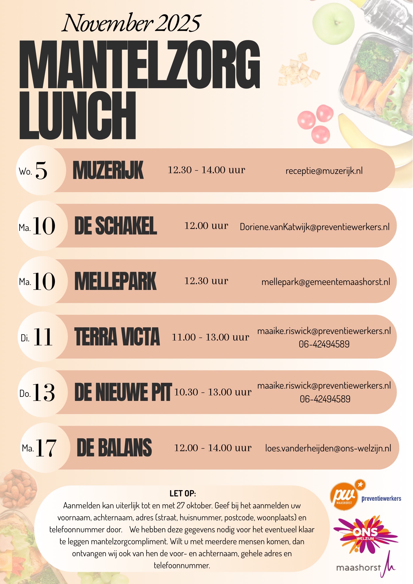 Ben jij mantelzorger? Dan ben je van harte welkom bij de Mantelzorglunch in Terra Victa op 11 november. Aanmelden kan tot en met 27 oktober bij Maaike Riswick via maaike.riswick@preventiewerkers.nl of 06-42494589. Geef bij het aanmelden je voornaam, achternaam, adres (straat, huisnummer, postcode, woonplaats) en telefoonnummer door.